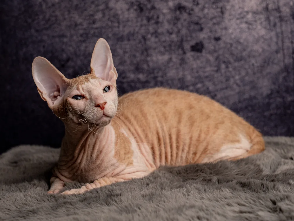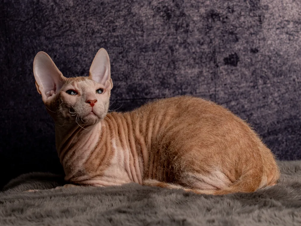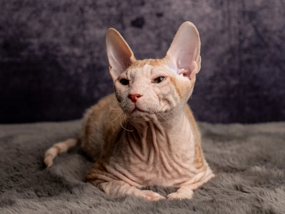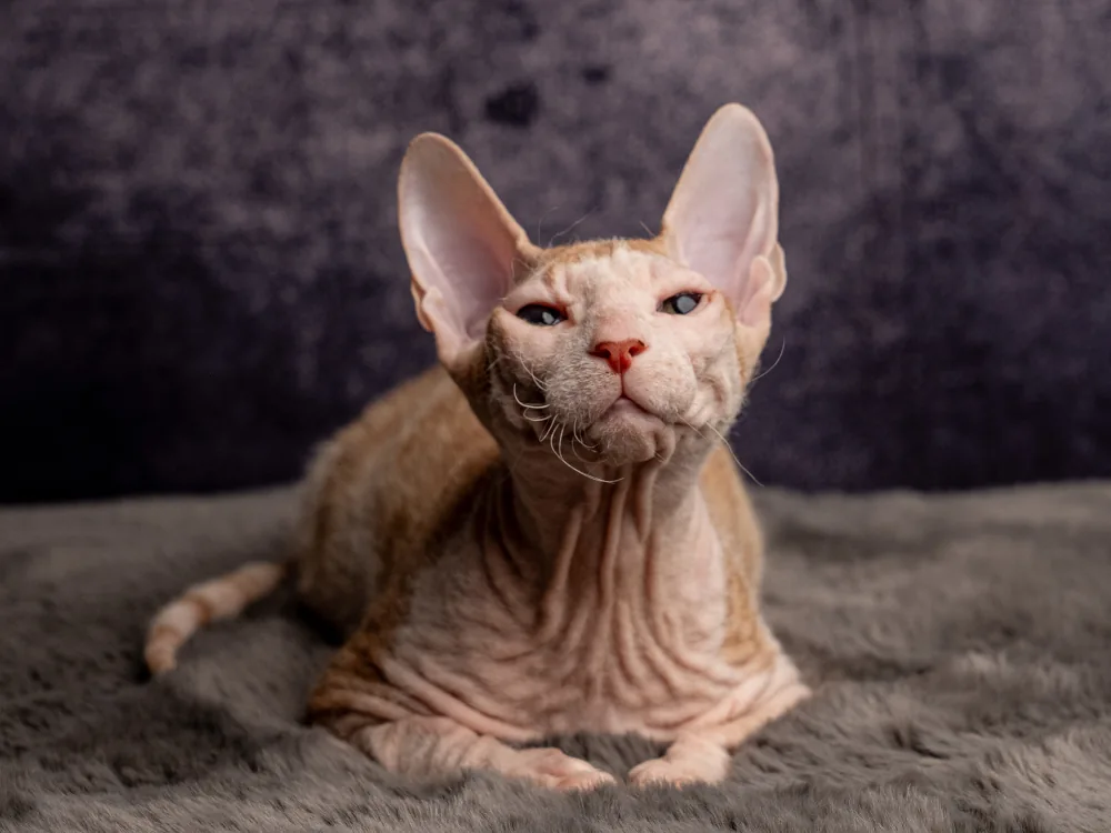 Ilon je kocourek plemene Ukrajinský levkoy (straight). Barva: červená bikolor.