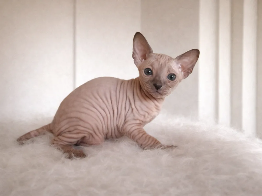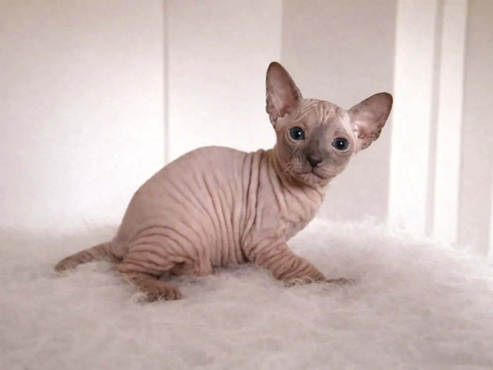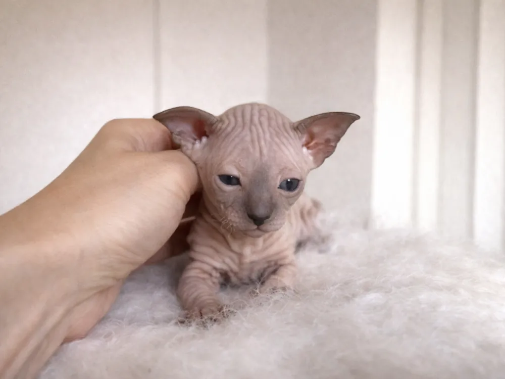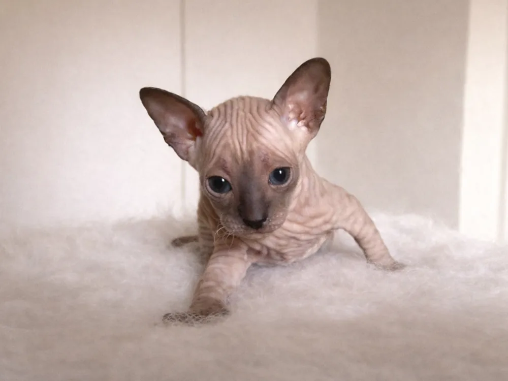 Kevin je kocourek plemene Ukrajinský levkoy (straight). Barva: seal point (modré oči).
