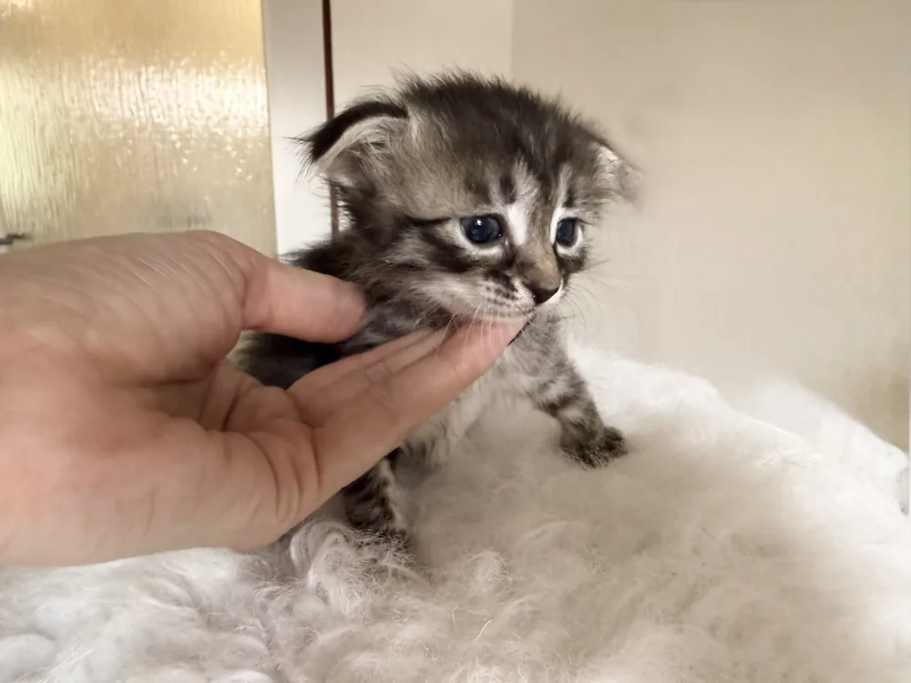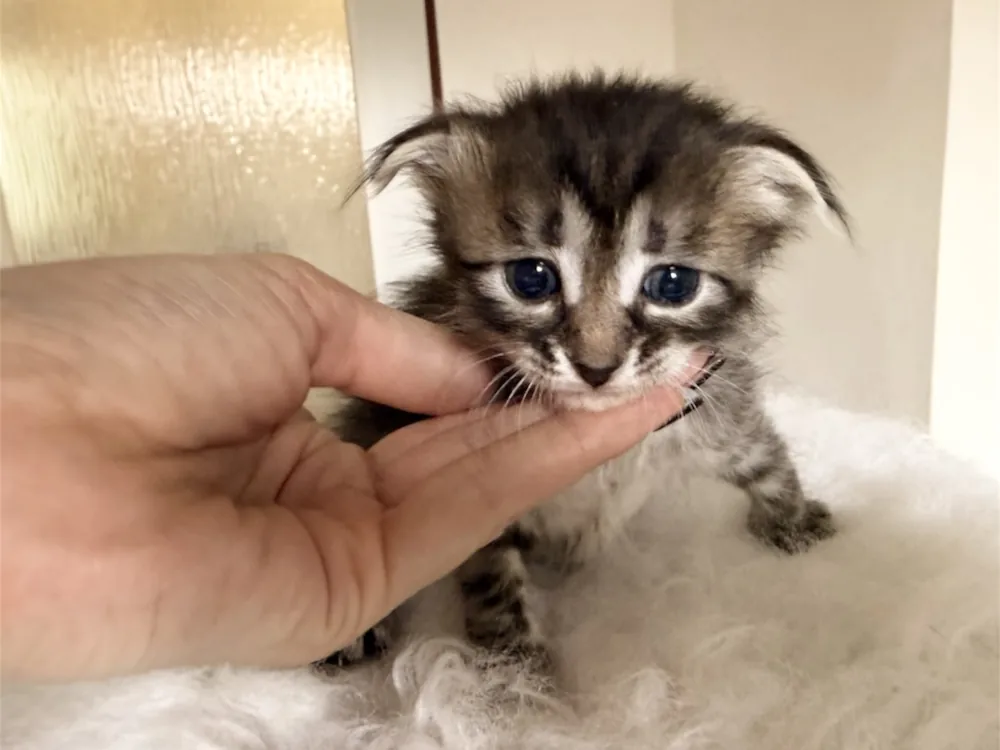 Klodina je kočičí slečna plemene Ukrajinský levkoy (fold) (osrstěný typ). Barva: černá pruhovaná.